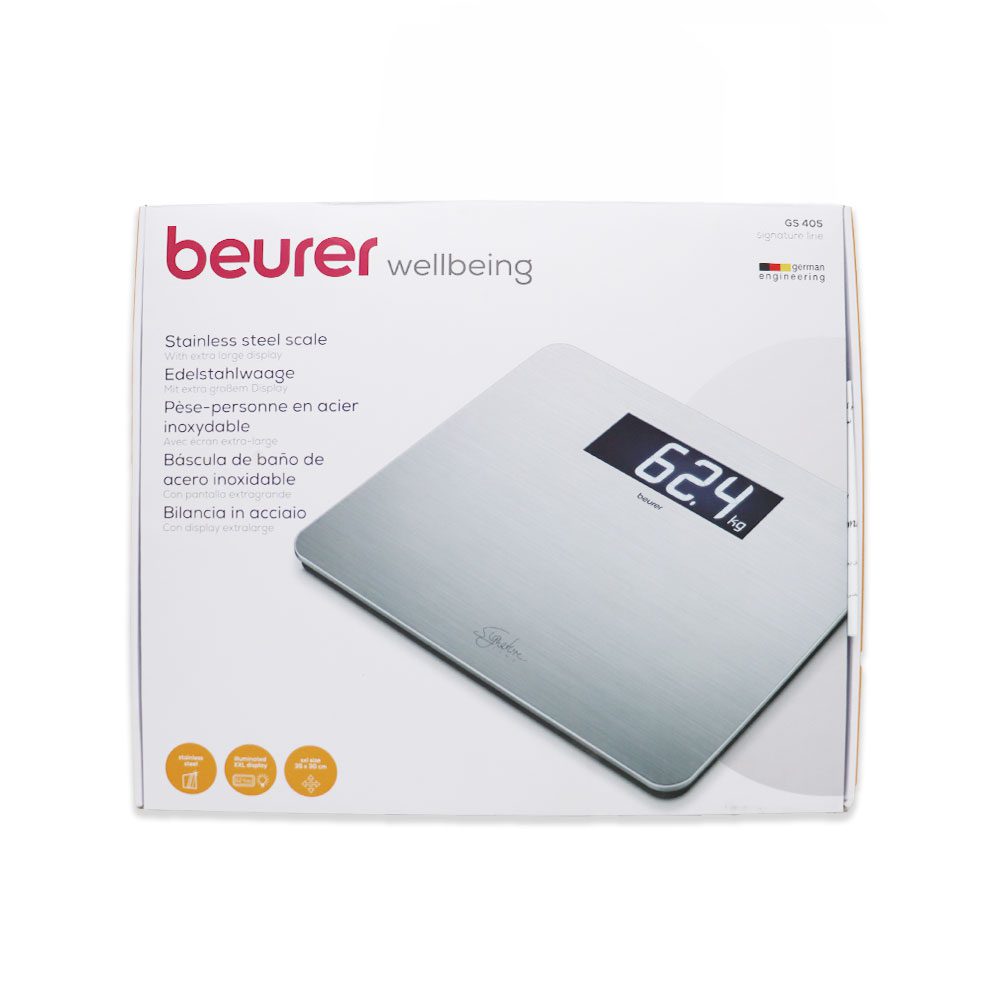 ترازو دیجیتال GS405 بخشی از مجموعه ترازوهای مدرن و زیبای برند آلمانی Beurer است که دارای بدنه استیل ضد زنگ، مواد با کیفیت بالا و فرمت XXL میباشد. این ترازو دارای صفحه نمایش LCD و طراحی شیک و زیبا میباشد. این ترازو میتواند تا 200 کیلوگرم را با دقت 100 گرم وزن کند. اگر وزن از ظرفیت آن بیشتر شود، با نگاه کردن به صفحه نمایش، خطا را مشاهده خواهید کرد.