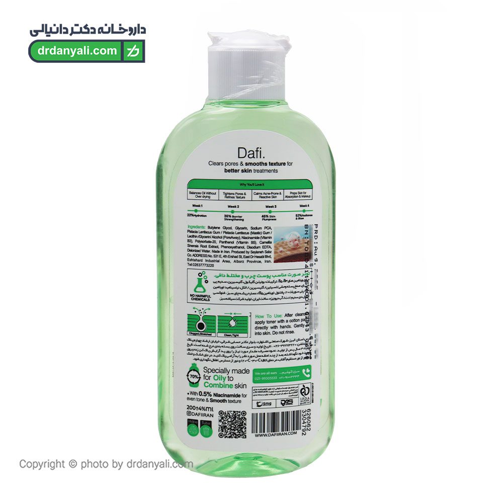 تونر متعادل کننده صورت دافی برای پوست چرب و مختلط، ۲۰۰ میلیلیتر، به طور موثری پوست را تمیز میکند و تمام ناخالصیها، چربی اضافی و بقایای آرایش را از بین میبرد. این تونر حاوی نیاسینامید است که به تنظیم تولید چربی کمک میکند و با تمیز کردن و سفت کردن منافذ، از بروز جوشهای سرسیاه و سرسفید جلوگیری میکند. این تونر به لطف گلیسیرین موجود در آن، از خشکی و کشیدگی پس از تمیز کردن نیز جلوگیری میکند و پوست را مرطوب میکند و آن را نرم و درخشان میسازد. تونر دافی که با عصاره ریشه چای سبز، که به دلیل خواص ضد التهابی شناخته شده است، غنی شده است، التهاب، قرمزی و جای جوش را تسکین میدهد.