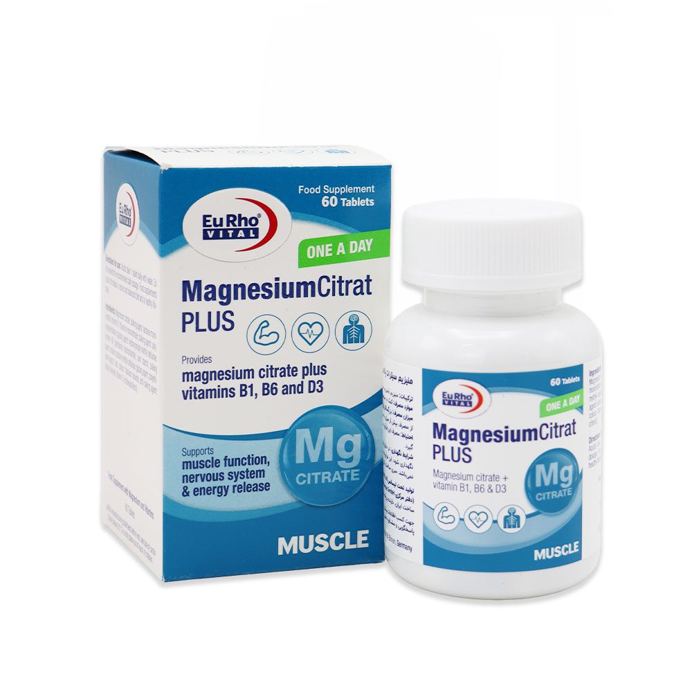 تحقیقات جدید نشان میدهد که سیترات منیزیم علاوه بر جبران کمبود منیزیم، در تسکین گرفتگی عضلات و میگرن بسیار مؤثر است. قرصهای سیترات منیزیم یوروویتال پلاس حاوی منیزیم به شکل سیترات و ویتامینهای B1، B6 و D3 هستند.