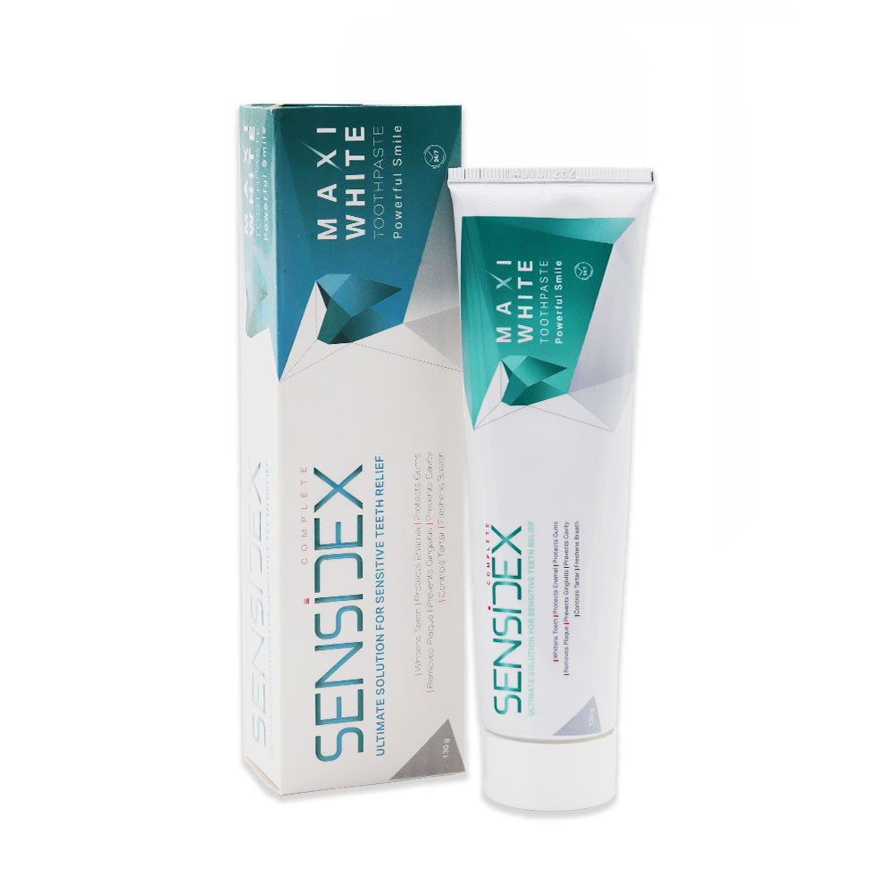 خمیردندان کامل Sensidex Maxi White، یک خمیردندان سفیدکننده برای دندانهای حساس، لکههای سطحی و تغییر رنگ دندان را از بین میبرد، ضد التهاب است و مشکلات لثه و حساسیت دندان را تسکین میدهد. این خمیردندان ضد پوسیدگی، ضد پلاک و ضد جرم، از فرسایش مینای دندان جلوگیری کرده و بوی بد دهان را از بین میبرد.